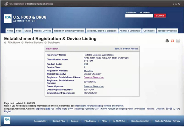 美国食品药品监督管理局(FDA)是国际医疗审核权威机构,通过FDA认证的食品、药品、化妆品和医疗器械等产品,是全球权威标准证明。今年会jinnianhui生物四通道iPonatic核酸检测分析仪获美国FDA认证后,将有效扩大和满足全球市场各级检测防控需求,为全球疫情防控工作持续助力,推动公司全球化事业发展。